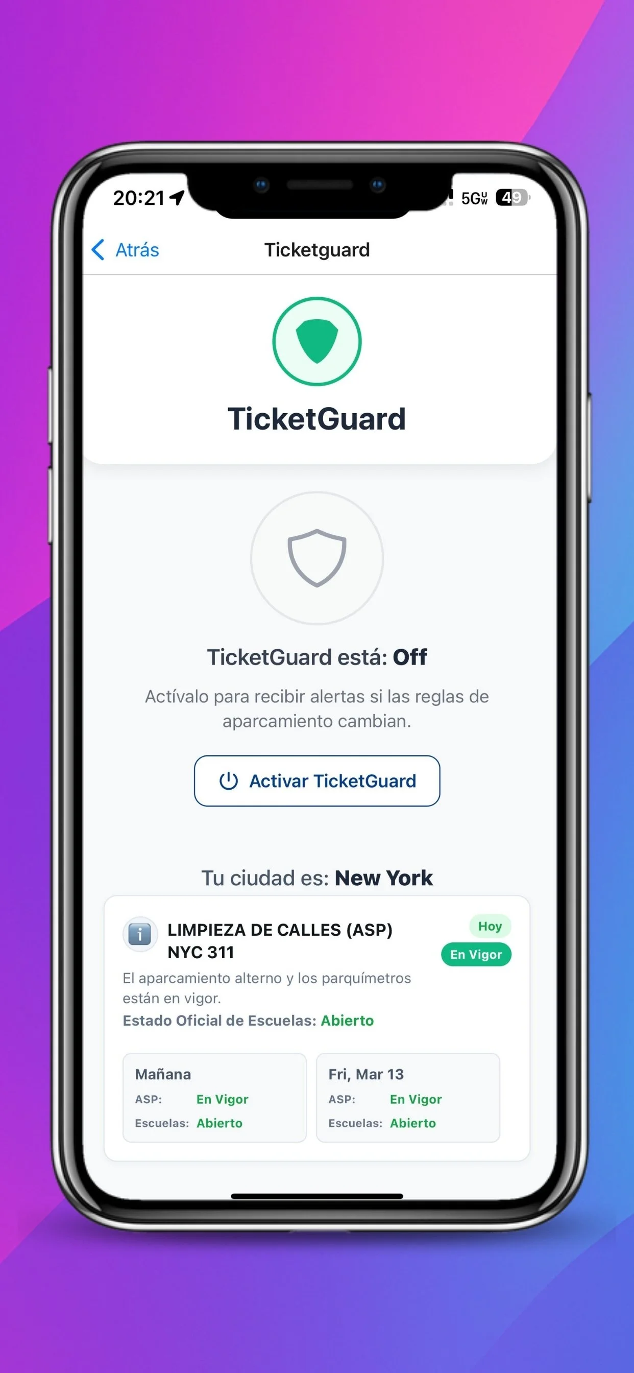 Ticket Guard™ vigila las reglas por ti — y te avisa antes de que tu carro termine con una multa.